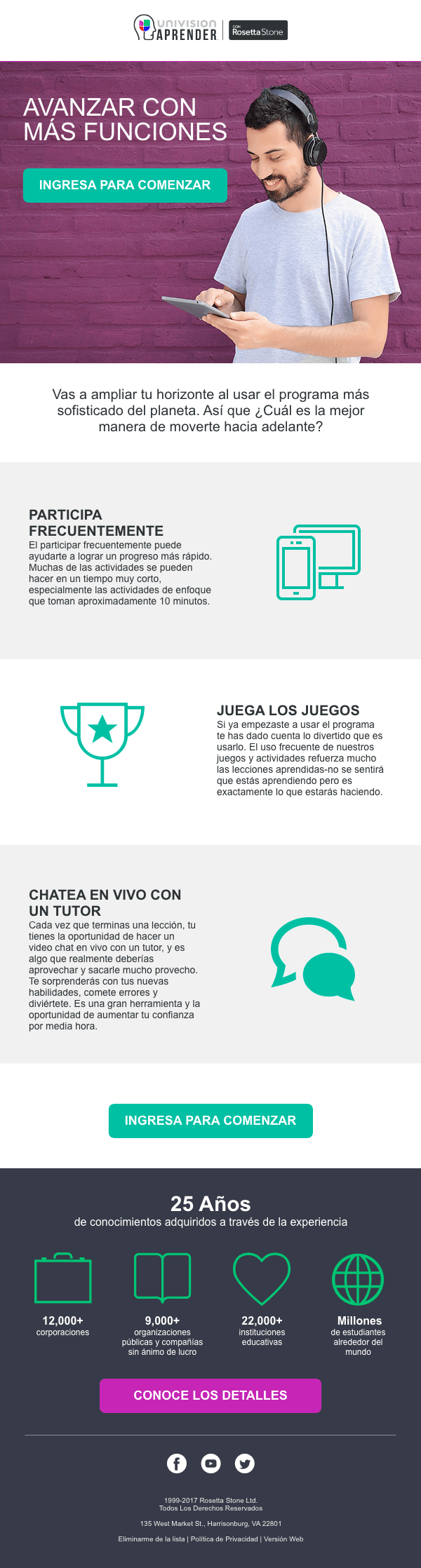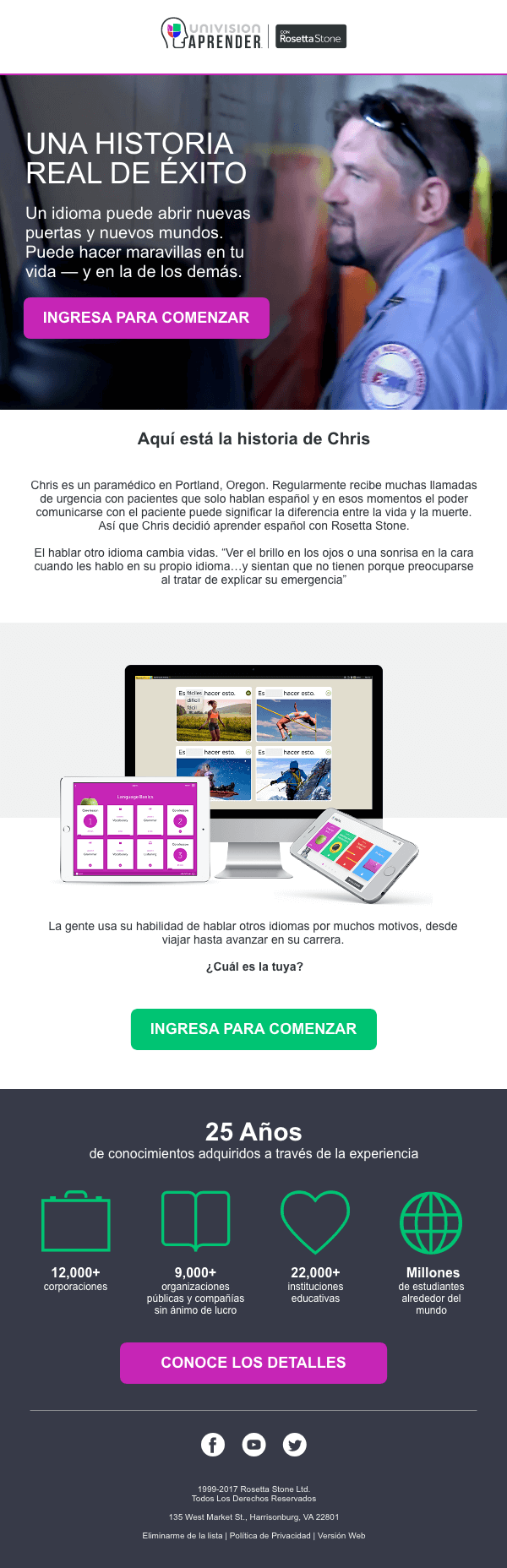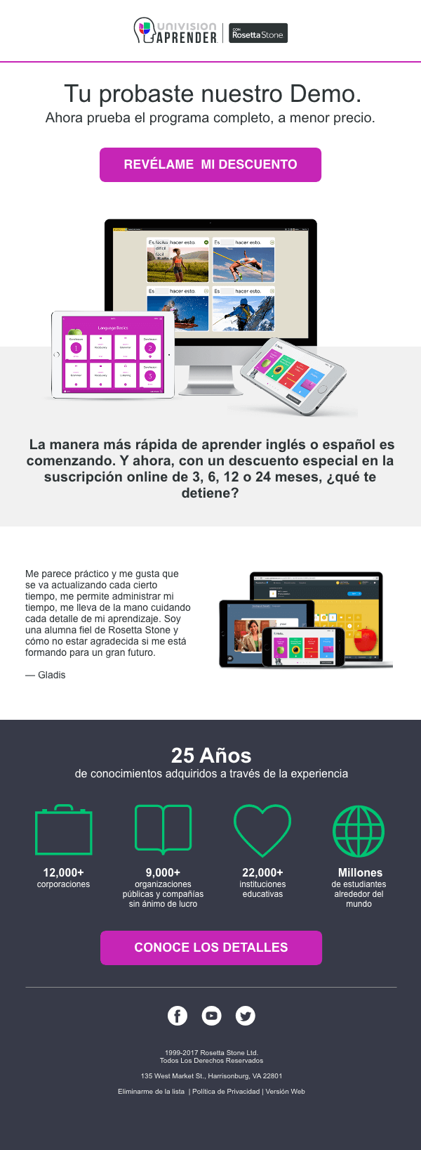 Through Rosetta Stone’s collaboration with Univision, I developed a Spanish-language onboarding email series designed to convert viewers into active English learners. The emails strategically promoted using the Rosetta Stone platform, increased user engagement, and provided a welcoming start to their learning experience.